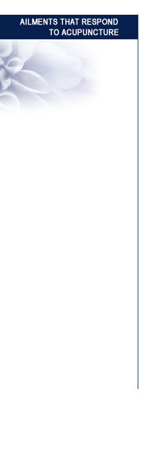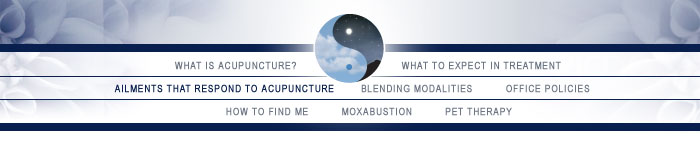 Chronic & Acute Pain Stress Depression Anxiety Headaches Infertility Menopause PMS Insomnia Asthma Arthritis Quit Smoking Weight Loss Addiction Treatment Sinusitis Colds & Flus Indigestion Constipation Hypertension Tendonitis Frozen Shoulder TMJ Sciatica Carpal Tunnel Syndrome Low Back Pain Fibromyalgia Chronic Fatigue Syndrome Diabetes Treatment for Side Effects of Chemotherapy & Radiation Therapy And Much More... |